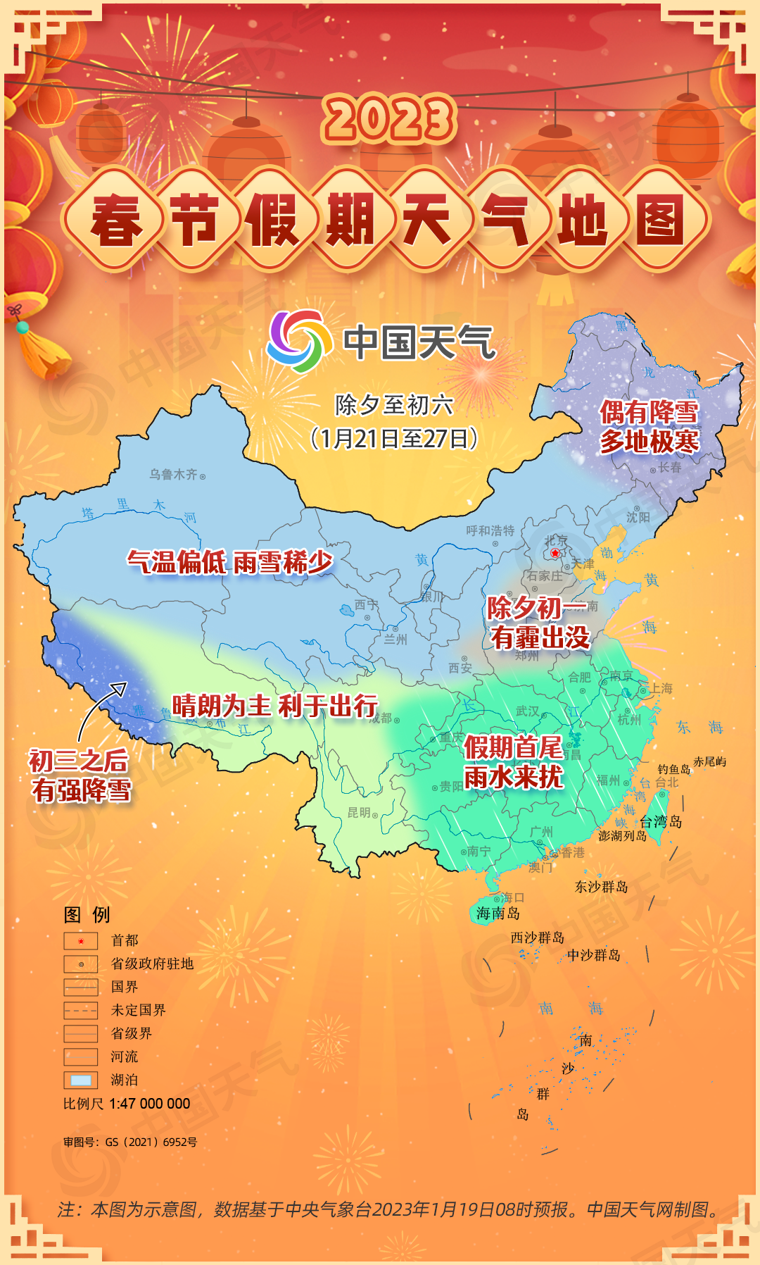 今天(1月19日)上午,中央气象台正式发布春节假期天气预报,预计2023年春节假期(除夕至初六)我国无大范围低温雨雪冰冻等灾害天气,冷空气活动较为频繁,中东部地区气温波动较大,内蒙古东部、东北一带气温偏冷明显,部分地区将现极寒。南方多地雨水中迎新春,除夕、初一及初五前后会有阴雨,需注意出行安全。
