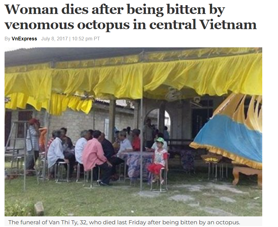 死者是32岁的Van Thi Ty,那一天她和丈夫出去捕鱼时,不小心被钓上来的一只章鱼咬了她的小腿。