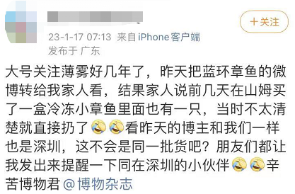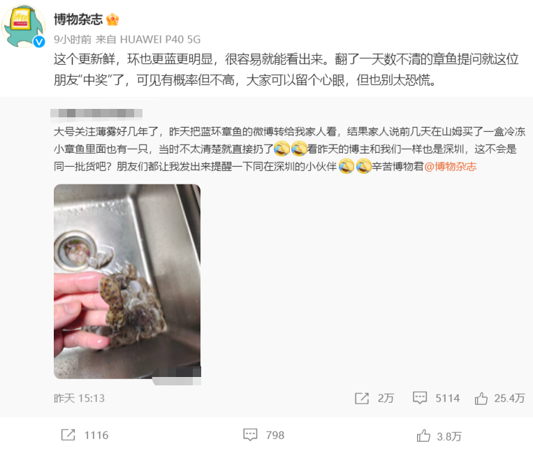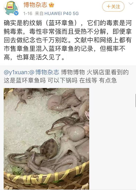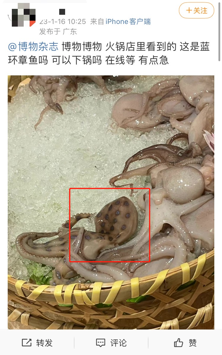 这位网友发出来的蓝环章鱼似乎更加新鲜,连博物杂志也证实了是蓝环章鱼。因为接二连三的蓝环章鱼事件,网友也都恐慌起来,纷纷把自己买到的章鱼拍照发帖@博物杂志。