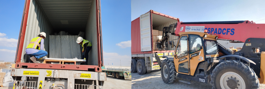 随着项目进展,客户对物流服务时效性有了更高要求。一批高货值的清洗机器人共计6个40尺高柜、1950件货物抵达阿布扎比港,由于是高货值精密设备,原计划现场厂商方安排掏箱。但由于项目现场高强度作业造成相关人员和设备不足,客户临时联系场站,提出即时安排工人和设备到现场掏箱作业,场站团队即刻响应和调度,1小时内按照客户要求安排就位并按时完成掏箱卸货,得到客户点赞。