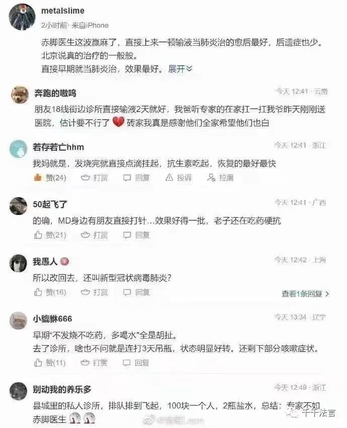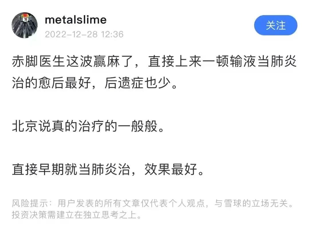 大意是这样的,农村的赤脚医生对付新冠,上来一顿输液当肺炎治,在四件套“抗病毒+抗生素+地塞米松(激素)+退烧药”的配合下,直接给治愈好了,后遗症也少。