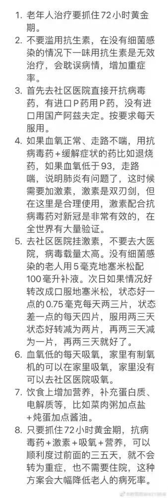这里简单摘录几点。比如他说,老年人治疗要抓住72小时黄金期;对于一些社区医院上来就吊水的方法,他直言不讳地指出,“只吊抗生素是无效的治疗方案”——在没有细菌感染的情况下一味用抗生素是无效治疗,会耽误病情,增加重症率……