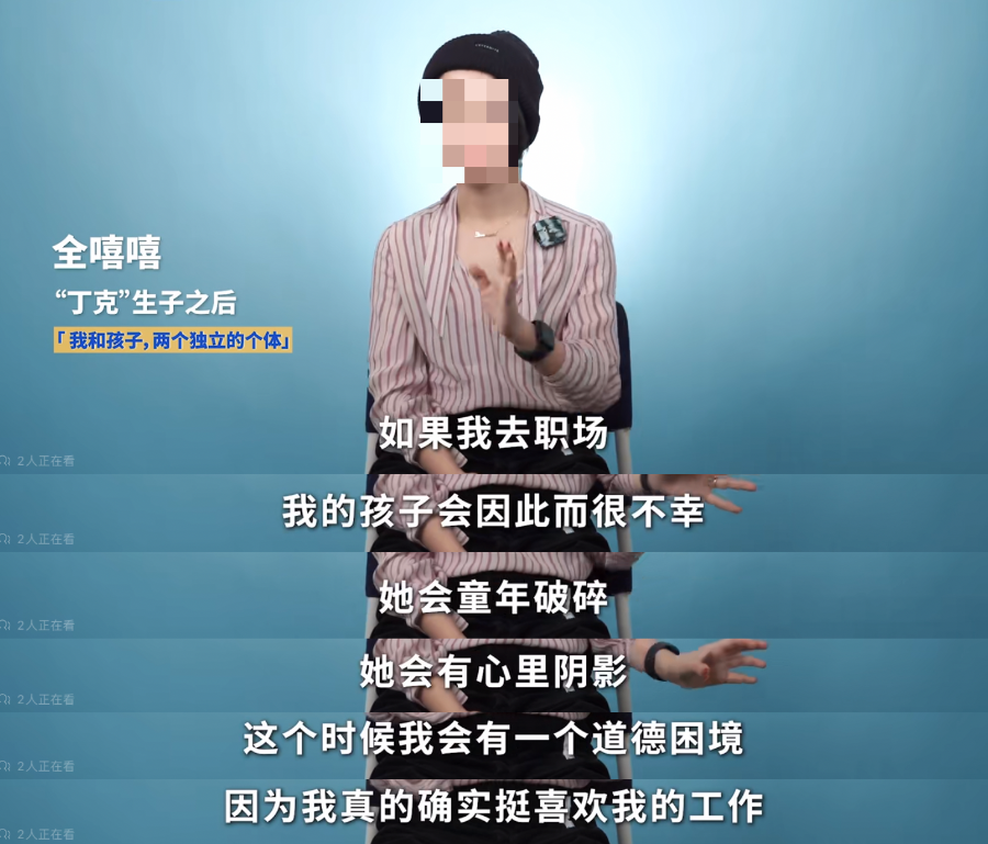 全嘻嘻当然是有心结的,我了解了一下她所谓过去 “被网暴”的经历,决定丁克又被迫生孩子,看起来是像个逃兵。但反过来说,如果不是她婚前就坚持丁克立场,已经做了巨大妥协,又何以能在产后逃脱巨量的无酬劳动?