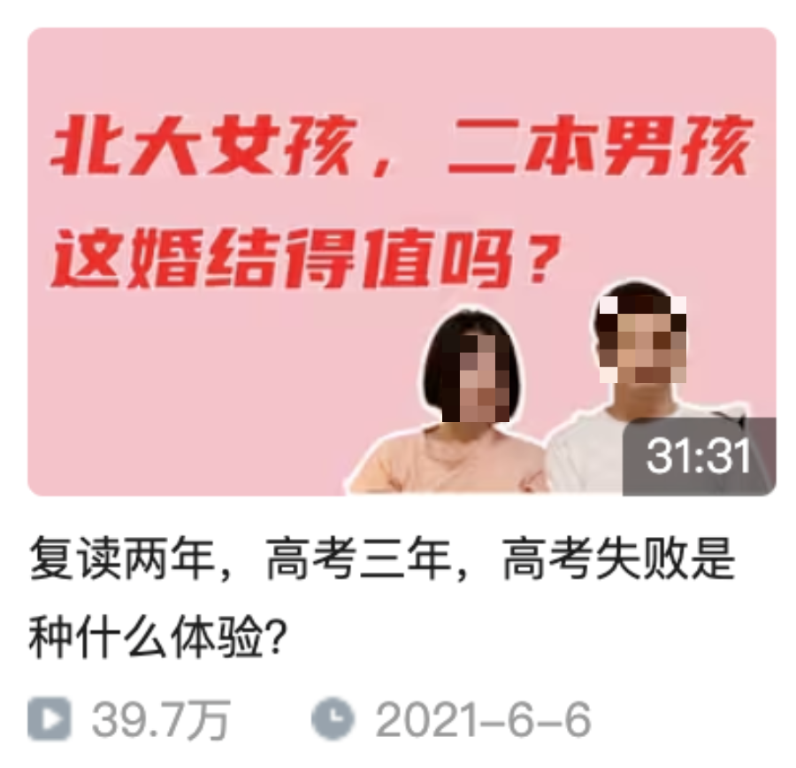 她还经常与老公一起做视频,分享婚姻中的问题与磨合,封面标题是《北大女孩与二本男孩》。
