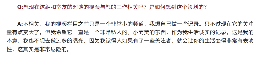 她首先是有预见性的,在视频栏目破圈之前,就已经意识到了(当博主)会让“生活变得非常有表演性”。