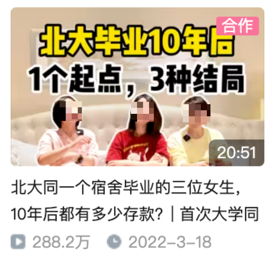 去年她就有另一个视频上过热搜,《北大毕业三位女生,10年后都有多少存款?》。