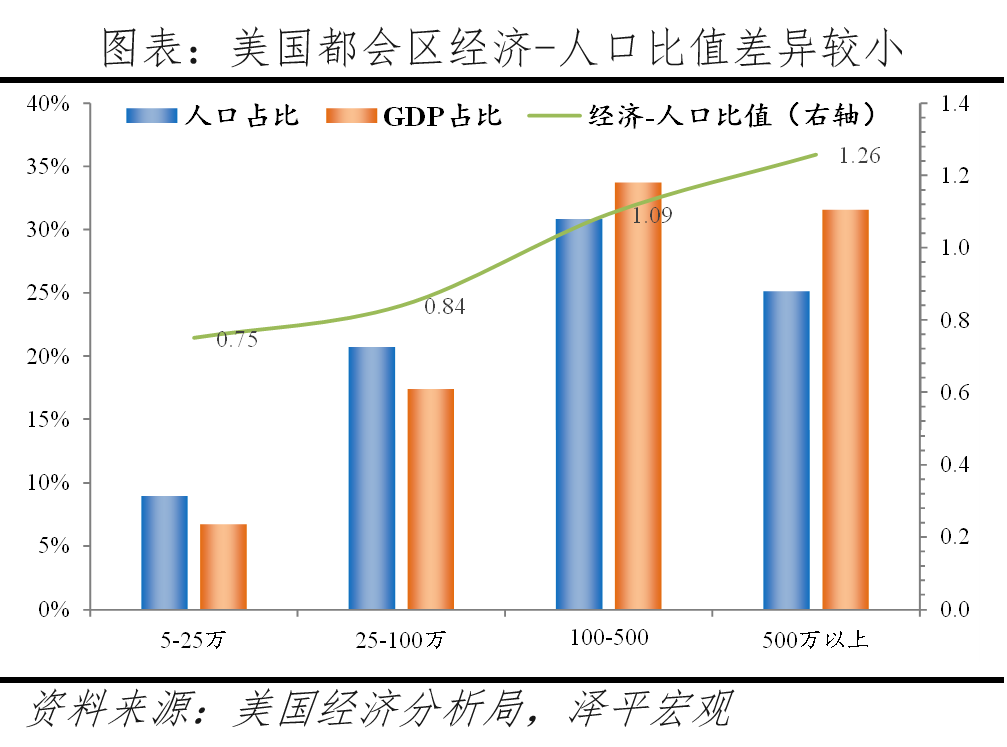 从都会区看,1910-2015年美国都会区人口比重从28.4%增至85.6%,其中人口向大都会区化集聚态势明显。2015年5-25万、25-100万、100-500万、500万人以上都会区经济-人口比值分别为0.75、0.84、1.09、1.26,差异较小。