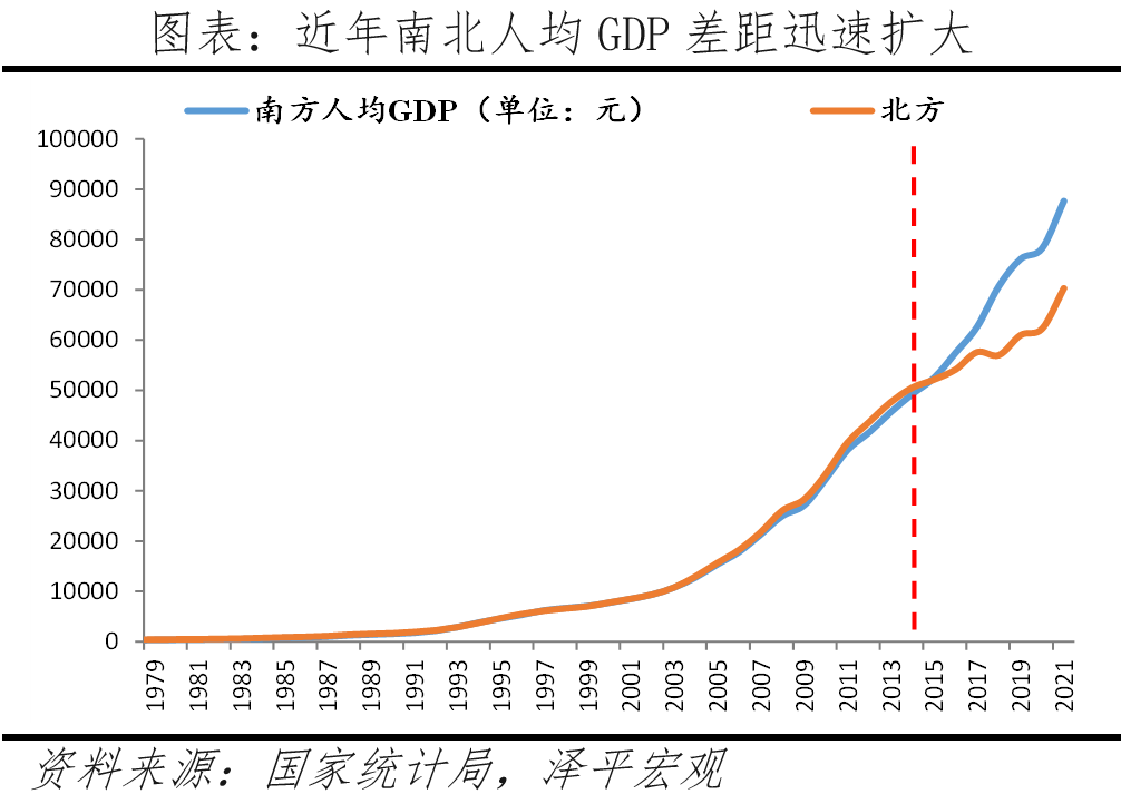 当前我国南北差距明显拉大。2010-2021年北方经济占全国总量从42.8%快速下降至35.2%,南北经济总量差距从14.4个百分点迅速扩大至29.6个百分点,人均GDP差距从0.97扩大为1.25。