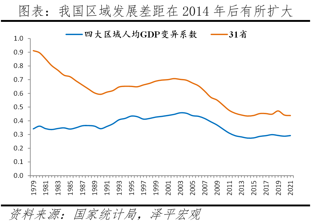 改革开放以来,我国区域发展差距总体呈缩小态势,但2014年后区域差距有所扩大。由于历史原因,新中国成立初期北方尤其是东北重工业基础良好、经济基础较好,20世纪50年代苏联援助也主要集中在东北。20世纪60年代基于国防安全考虑的“三线建设”促进了中西部地区经济发展,1960-1977年人均GDP最高的东北与最低的西部的差距由3.06降至2.20。1978年改革开放后,东部基于区位优势率先发展,大量人口从内地向东部集聚,1991年东部人均GDP超过东北居四大区域之首,其人均GDP与最低的西部的比值一度扩大至2003年的峰值2.61。2003年后,随着西部开发、东北振兴、中部崛起等区域发展战略的实施,以及2008年金融危机后沿海地区向内地转移产业,各区域人均GDP相对差距逐渐缩小,但2014年后有所扩大。
