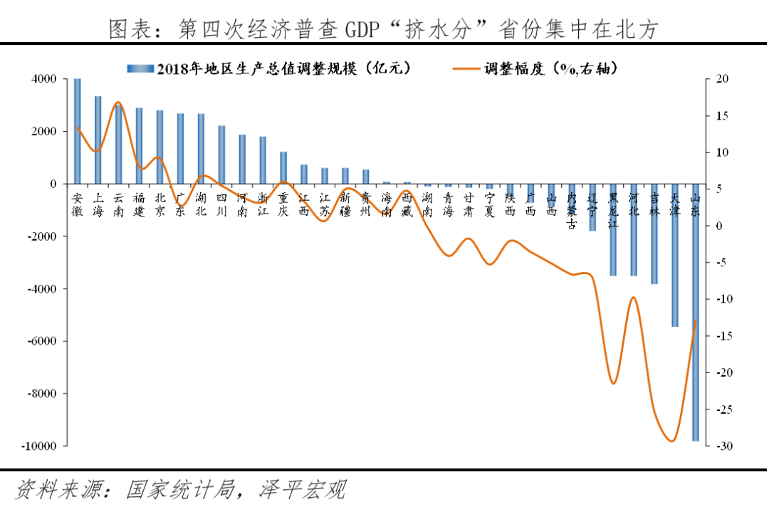 从经济普查等情况看,南北差距拉大的情况可能发生更早,但被北方较多的数据注水掩盖。2014年,中央巡视组发现东北地区经济数据注水严重;在“挤水分”之后,2016年辽宁名义GDP较2015年缩水22.4%。2018年第四次全国经济普查后,全国GDP比初步核算数增加2.1%;其中,南方16省有14省上调、2省下调,北方15省有12省下调、3省上调。下调超过10%的有天津、吉林、黑龙江、山东,均为北方省份,分别为-29.0%、-25.3%、-21.5%、-12.8%。山东调整幅度超过甘肃省2019年GDP(8718亿元),天津调整幅度超过海南GDP(5309亿元)。部分地区GDP的大幅调整,虽然有统计标准规范和调整的因素,但更与挤掉多年累积的GDP“水分”有关。(注:第五次全国经济普查将在2023年进行。)