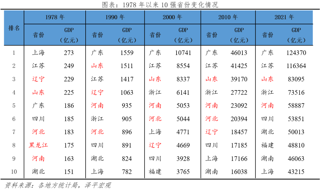 从10强省看,1978-2021年北方从5个降至仅剩山东、河南2个。1978-2021年,我国10强省经济份额从54.9%提升至61.0%。在改革开放初期,北方在我国10强省中占据5席,其中东北占两席(辽宁、黑龙江)。之后,东南沿海省份迅速崛起,1984年浙江取代黑龙江进入前10。此后,北方的山东、辽宁、河南、河北长期位居前10。由于2010年后经济转型缓慢,辽宁、河北先后在2016、2018年跌出全国前10。目前北方在全国经济10强中仅剩山东、河南两省。其中,山东从1980年起一直位列前3,2007年开始持续位居第三,但与第二名江苏的差距从2007年的242亿元持续扩大2021年的3.3万亿元。2018年,山东生产总值迎来改革开放后首次负增长,与2017年相比下降了8.2%,这是因为当年山东设立新旧动能转换综合试验区,正在经历经济转型的阵痛;2021年,成功转型为山东经济增长注入了新动能,地区生产总值达8.3万亿元,增长13.6%,山东稳固了经济大省的地位。