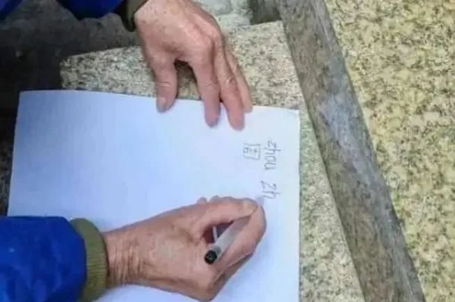 老人用枯树一样堆叠着皱纹的手,斜握着笔,颤颤巍巍地在白纸上写下他们的名字。