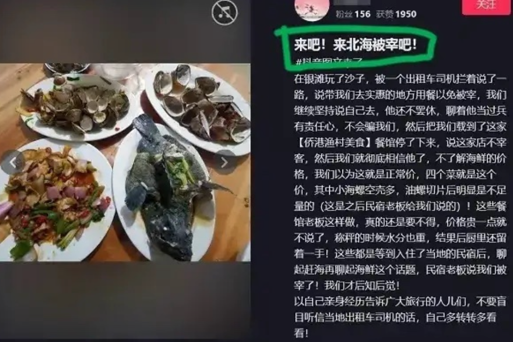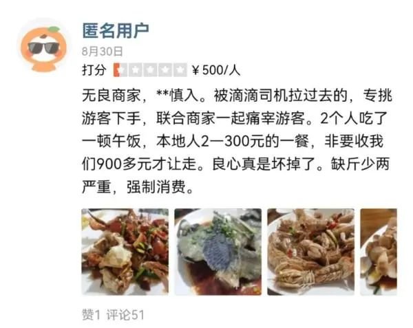 事实上,某点评平台上,早在去年8月底就有消费者匿名点评称,“被滴滴司机拉过去的,专挑游客下手,联合商家一起痛宰游客。本地人200~300一餐,非要收我们900多元才让走。”