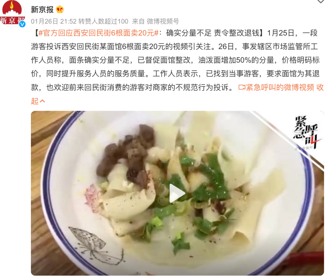 生意好起来的同时,更要重视旅游体验。前几天,西安旅游景点的biangbiang面,20块钱只有6根面条,引发网友热议,比起平时的分量天差地别不说,游客根本吃不饱。对此,官方回应称分量确实不足,已督促面馆整改,不能让游客到西安吃不饱。
