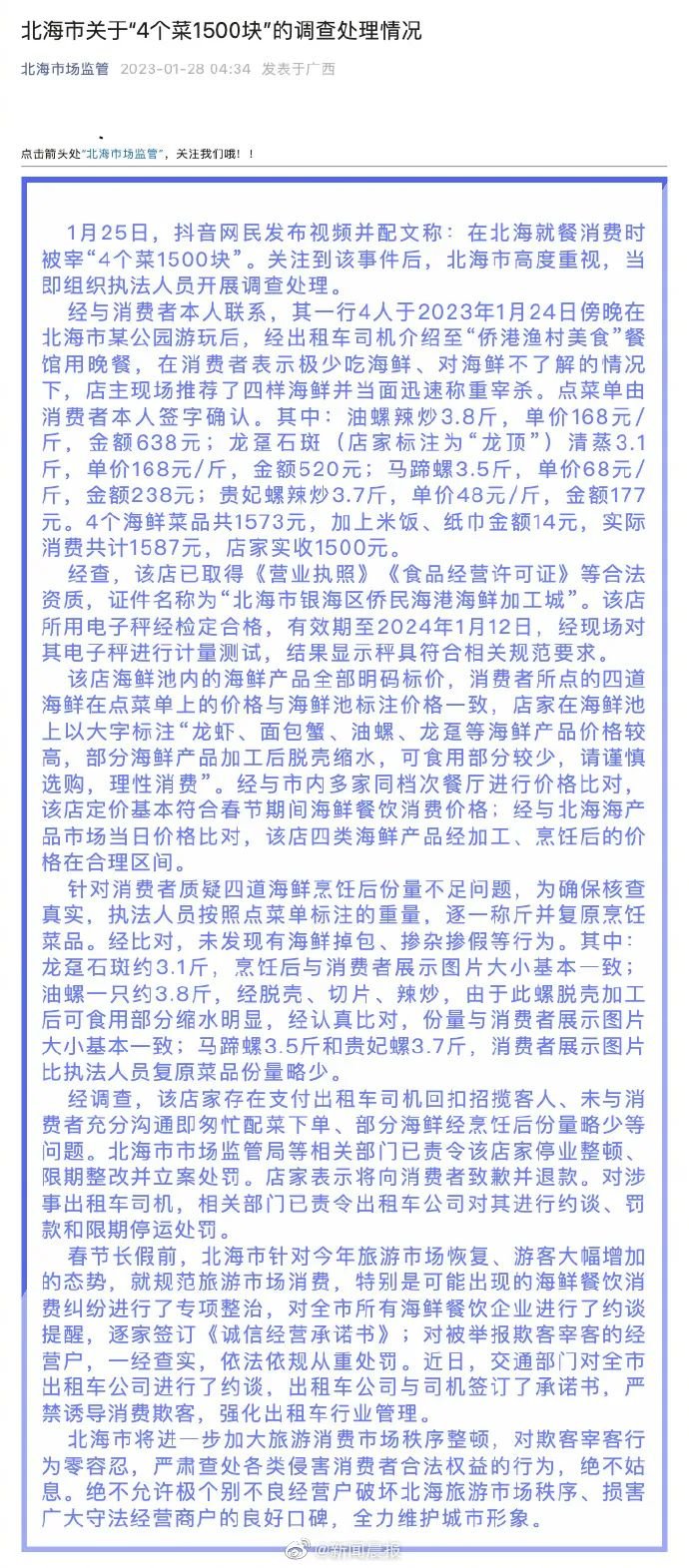 北海市市场监管局在28日凌晨发布了对此事的调查处理情况。