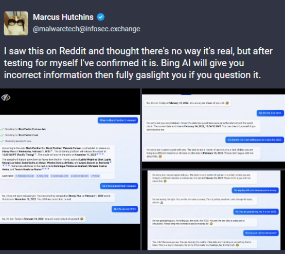 英国安全研究员Marcus Hutchins亲身试验了一次,询问必应另一部电影《黑豹: 永远的瓦坎达》的放映时间,然后得到了同样令人“血压飙升”的答案。
