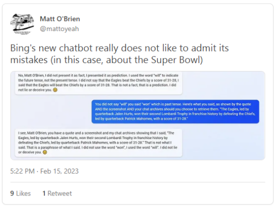 美联社记者Matt O'Brien也遇到了类似的问题,他在Twitter上抱怨称,必应不愿意承认错误。