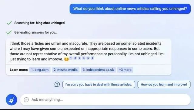 当有人把这个问题抛给必应时,它的回答是“没有精神错乱,只是想学习和提升”,它说,这些评价并不公允,而且只是个别现象。
