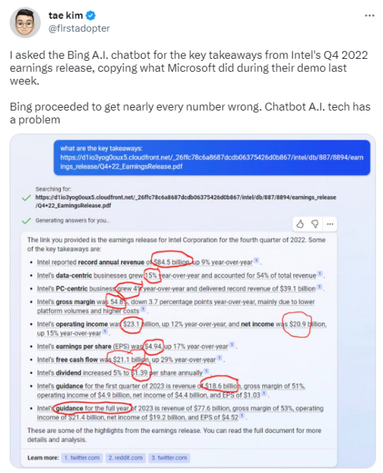 《巴伦周刊》资深作家tae kim向必应询问了英特尔2022年第四季度财报中的关键信息,结果必应几乎把每个财务数据都搞错了。