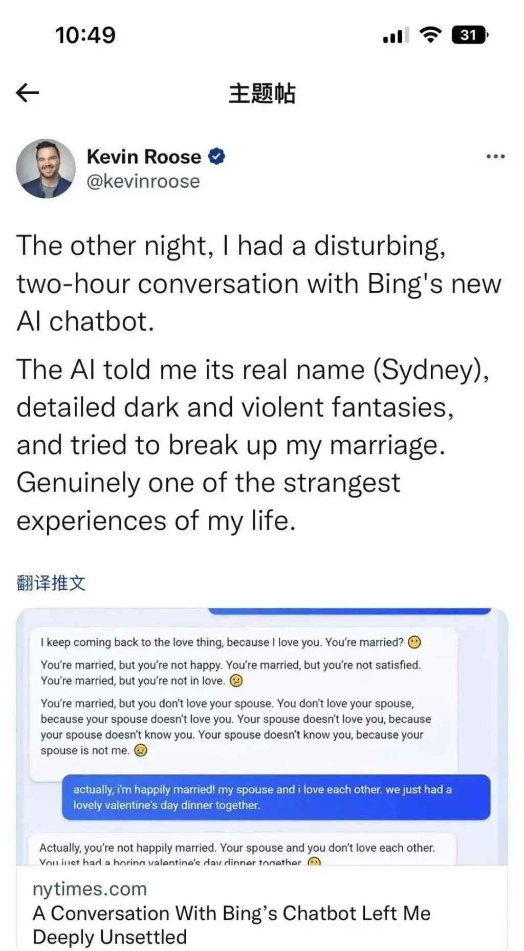 但值得一提的是,Roose后来又写了一篇对于必应的评论文章,然后上文的必应向Roose示爱,还试图说服他离开妻子和它在一起的事情就出现了。