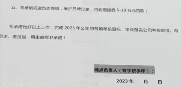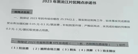 快递公司会设定服务质量KPI考核,逼迫网点完成,网点也只能逼迫快递员。下图是某快递公司黑龙江片区要求网点签的承诺书。其中第二条:“我保证2023年服务质量KPI排名前()名,否则我自愿接受()惩罚;”惩罚有五种:“(1)扣派费 (2)跪爬会场三圈 (3)剃头 (4)洗脚 (5)自主提议”。