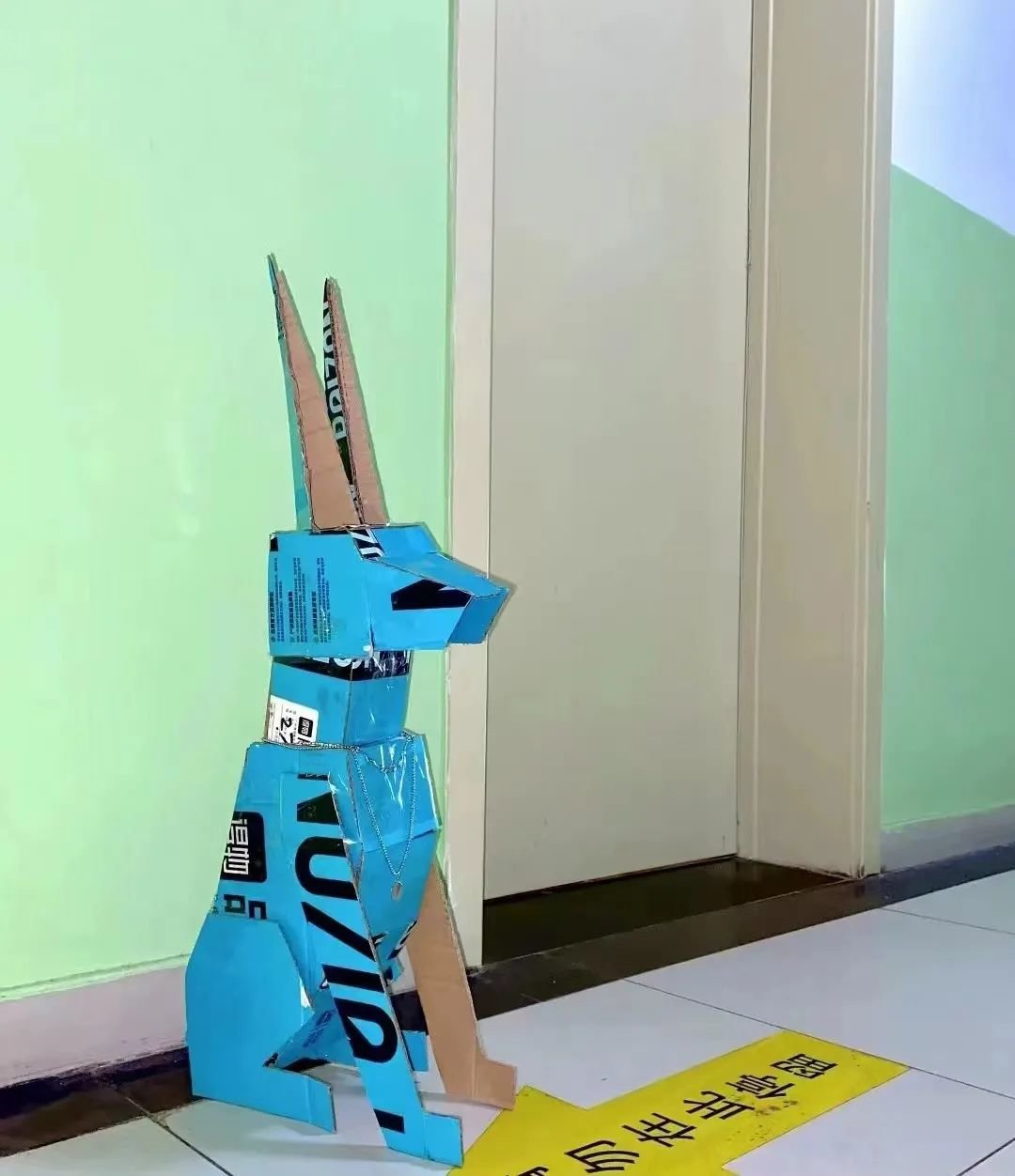 我朋友圈有一个女生做了一个杜宾,放在寝室门口。拿纸盒做的,颜色比较亮,看起来很帅,坐得也很正,有同学会去她们寝室门口打卡合照。