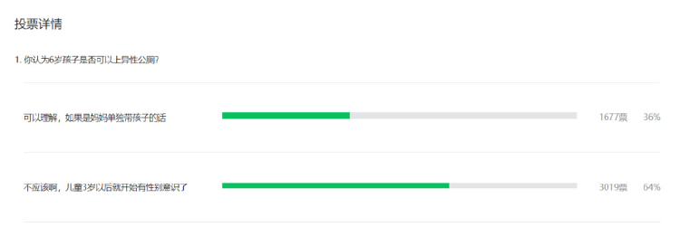 在央广网发起的“6岁孩子是否可以上异性公厕?”投票中,有36%的网友认为“可以理解,如果是妈妈单独带孩子的话。”;有64%的网友认为“不应该啊,儿童3岁以后就开始有性别意识了。”