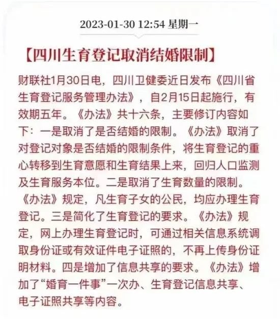 文章简介:四川省卫健委近日发布《四川省生育登记服务管理办法》(以下简称《办法》),自2月15日起施行,有效期五年。《办法》共十六条,主要修订内容如下:一是取消了是否结婚的限制。《办法》取消了对登记对象是否结婚的[db:内容简介]