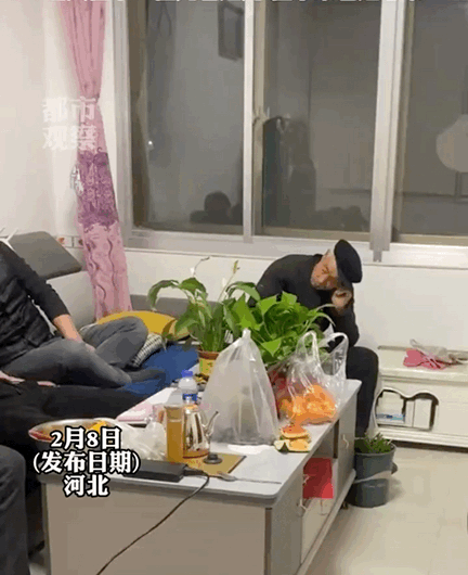 而视频里的大伯,却一个人落寞地坐在角落里,满眼羡慕。