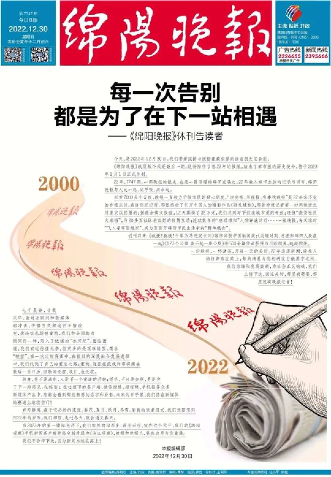 与此同时,今日出版的《绵阳晚报》头版刊发休刊词,称“每一次告别都是为了在下一站相遇”,这份陪伴读者22年的报纸,将于2023年1月1日起正式休刊。