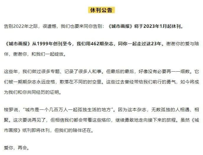 12月30日“城市画报”微信公众号刊发休刊公告,称《城市画报》将于2023年1月起休刊。