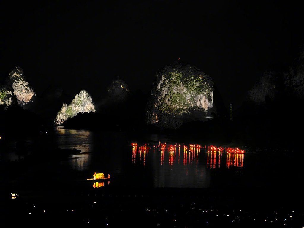 2022年7月24日晚,广西桂林市阳朔县,《印象·刘三姐》演员在展现“漓江渔火“。新京报记者 吴淋姝 摄