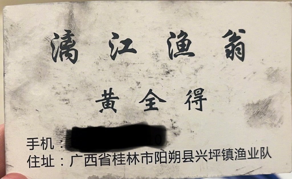 他递给记者一张名片,上面加粗印着“漓江渔翁黄全得”、手机号和住址。他的儿子黄金忠解释,“得”应为“德”,应该是打印店的人搞错了,因为老人不识字,也不晓得印得对不对。