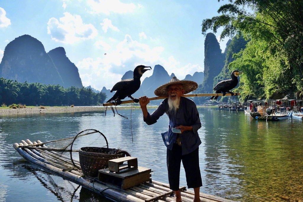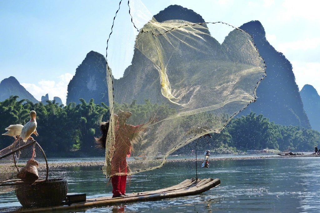 漓江景区鼓励老的渔民带着年轻的渔民习练训鸬鹚、撒网捕鱼等经验,希望将渔翁的形象保留传承下来。