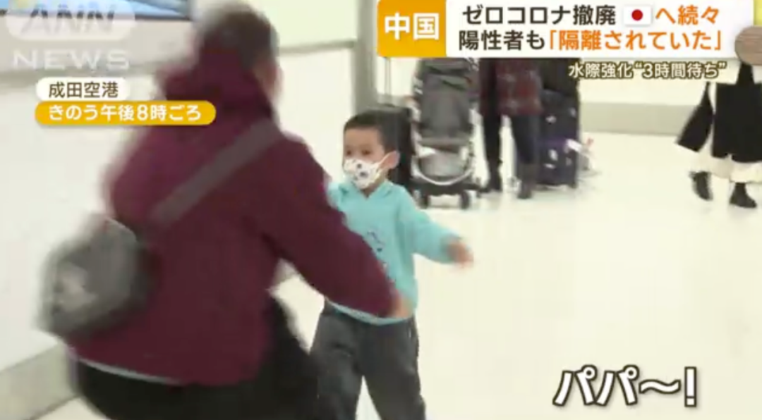 在成田机场,小男孩一抵达“到达大厅”,就用稚嫩的童声大喊“爸爸”。他迫不及待地一路小跑、冲向许久未见的爸爸的怀里。