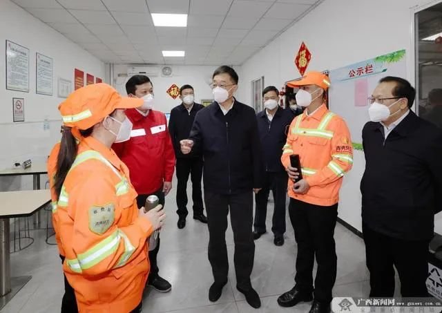 刘宁来到南宁市双拥路生活垃圾转运站,检查春节期间环卫工作开展情况,察看环卫工人爱心驿站,与环卫工人一一握手交谈,感谢大家的坚守与付出,给大家拜年。