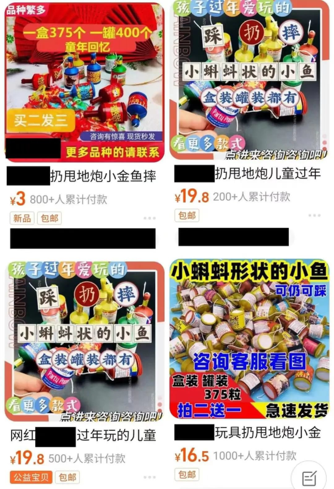 而受小孩青睐的摔炮 看似不能网购,但换了搜索词,诸如「甩地炮」「走地炮」「儿时小鞭炮」,马上就能发现已经月销2000+了,做这种擦边小鞭炮生意,不仅要懂尺度,还得语文好。