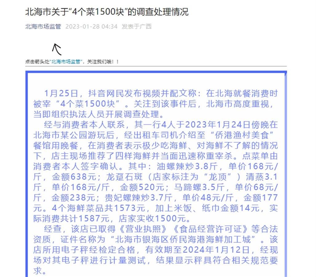 根据1月28日北海市场监管微信公众号发布的通报,当地市场监管部门关注到该事件后,高度重视,并组织执法人员进行调查处理。