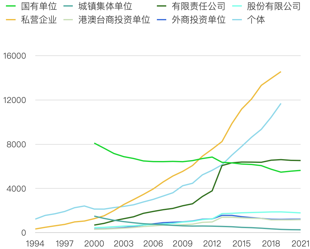 1994年到1996年,国有工业企业利润占比从50.5%降至29.3%。非国有经济(集体、个体、私营和外资经济等)快速成长,逐渐成为国民经济的主体,在全部工业企业总产值中占比为71.5%。城镇工作人员在各类型工作单位的占比在1994年之后的变化如下: