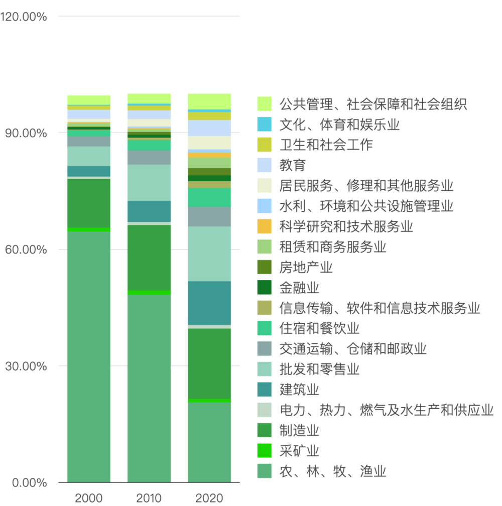 根据最近三次每十年一度的人口普查数据可以看到,各行业的从业人员占比发生了明显变化。