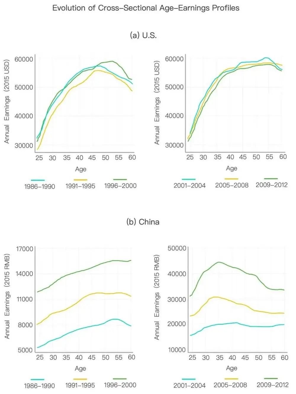 在宾夕法尼亚大学的研究中,将工资随着年龄变化的原因分解成三个部分:工作经验、时间效应(不同年份的平均工资水平变化)和队列效应(每个世代的劳动者能力差异)。他们发现美国不同年代的时间效应和队列效应很小,但在中国这两者影响巨大。这种中国经济发展、教育水平带来的工资变化效应远远超过了个人工作经验增长的价值,因此在具体时间截面上观察工资和年龄的关系,35岁左右是最高的。