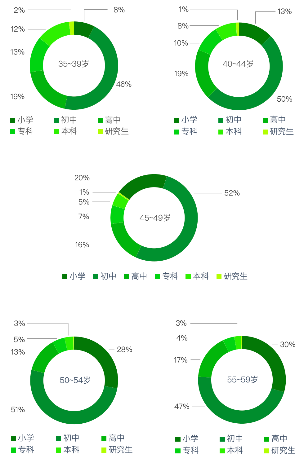 从受教育程度来看,中年相对年轻的年龄层明显本科和专科率要数倍于更年长的群体。