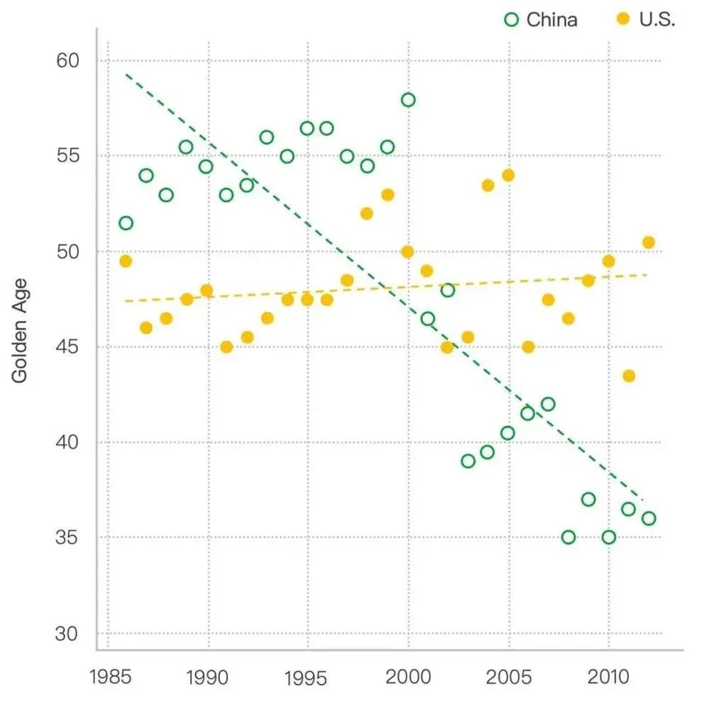 美国和中国的2000年以前,“黄金年龄”稳定在50~55岁左右。2000年以后美国继续不变,但中国的黄金年龄不断下降,到2005年以后降至35岁。