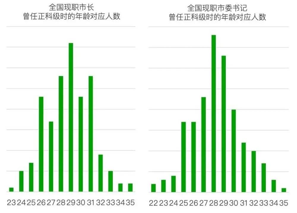 有研究收集了全国市委书记和市长初任正科级时的年龄,分析结果发现他们任正科级时年龄范围趋向一致,集中在28岁上下,且最大也不超过35岁。地级市在中国行政体系中是非常重要的一个关键环节,在省和县之间发挥着至关重要的纽带作用。国家对地市级干部的培养和选拔从他们正科级时就已经开始了。