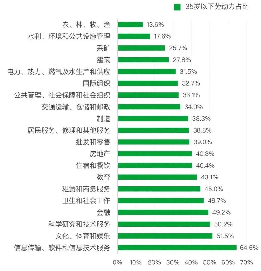 第七次人口普查数据显示,信息传输、软件和信息技术服务业,文化、体育和娱乐业,科学研究和技术服务业,金融业这四大类行业的35岁以下就业人口占比位居前四,而这些恰恰是产业结构变迁中越来越重要的主力产业。