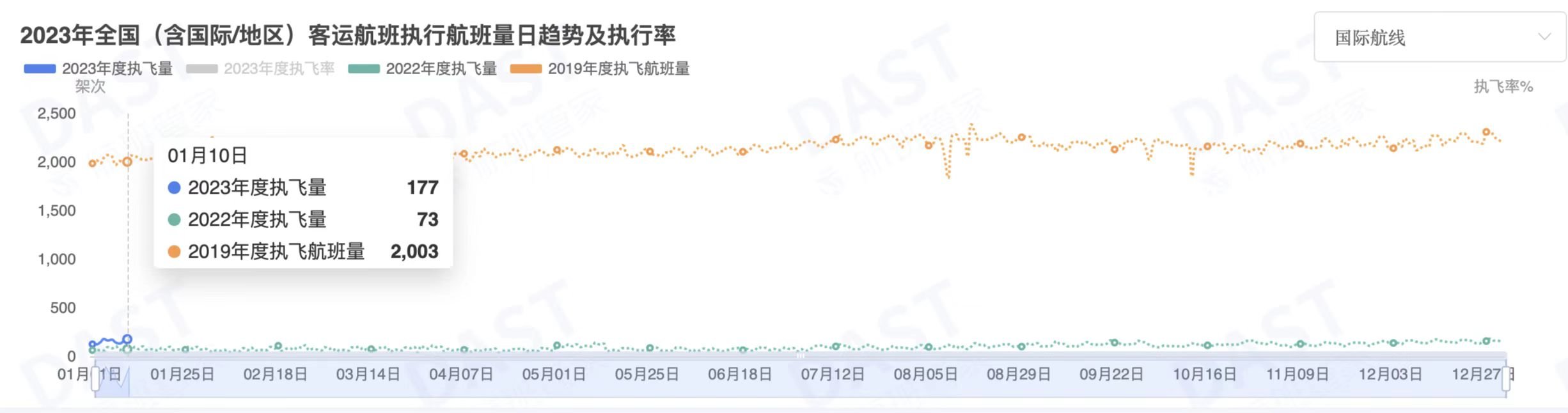记者从航班管家获得的最新数据显示,1月10日我国国际/地区客运航班量往返一共177班,而在疫情前的2019年同期,往返国际/地区航班量是2003班。目前的航班量依然只有疫情前的8.8%。