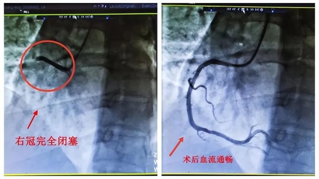 冠脉造影提示王大哥右冠近段完全闭塞,必须马上开通血管。刘喆团队仅用时5分钟即为患者开通闭塞的血管并植入支架一枚。术后,患者胸痛不适症状随即缓解。