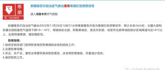 可以预见,在寒潮的强大实力,以及连续暴雪之后“雪后寒”效应的叠加之下,新疆的降温将达到历史同期的极端水平。为此,新疆自治区气象台发出了非常罕见的寒潮红色预警,预计天山南北都将有悬崖式的猛烈降温,乌鲁木齐的白天最高气温,将从零上3度,掉落到零下十六度,而阿勒泰地区甚至会有-40度的极寒出现,在11月下旬极端罕见。