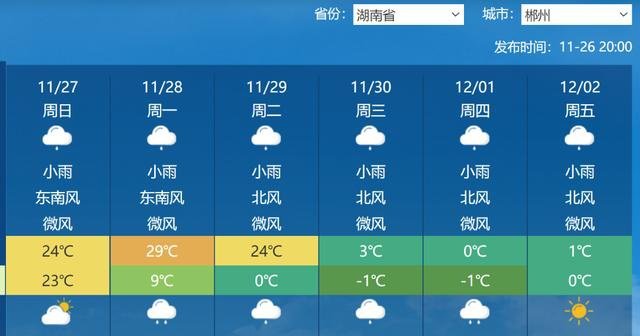 而到了长江流域,寒潮将遇到暖湿气流的顽强抵抗,冷暖空气在此剧烈交汇,在越下越冷的雨甚至雪、冰粒、冻雨中,江南将出现11月罕见的猛烈降温,其中湖南、贵州等地降幅可能超过20度。以湖南郴州为例,寒潮来之前,这里白天升到29度,夜里升到23度,寒潮来之后这里的气温系统好似突然归零,白天垂直落体降到0度,夜里-1度,与此同时可能伴有冻雨。相比之下,江浙沪的降温要温柔不少,但也是普遍的白天降二十度左右,夜里降十五度左右的配置。