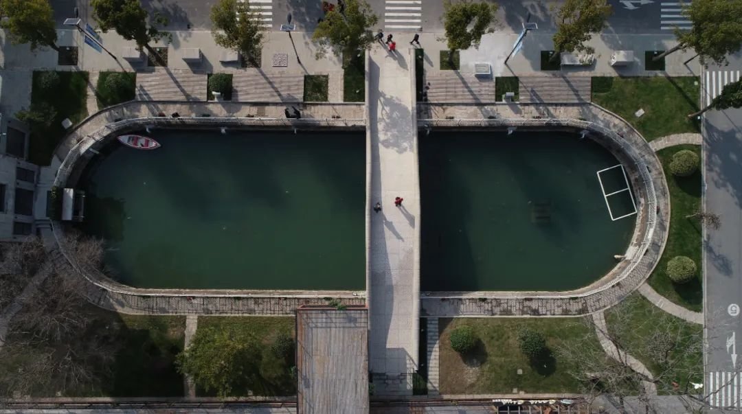 这座步行桥位于上海宝山区,桥长26.3米、宽3.6米,像一抹灰色飘带架在河面,坡度陡峭。桥栏板呈流线形,浑然一体。